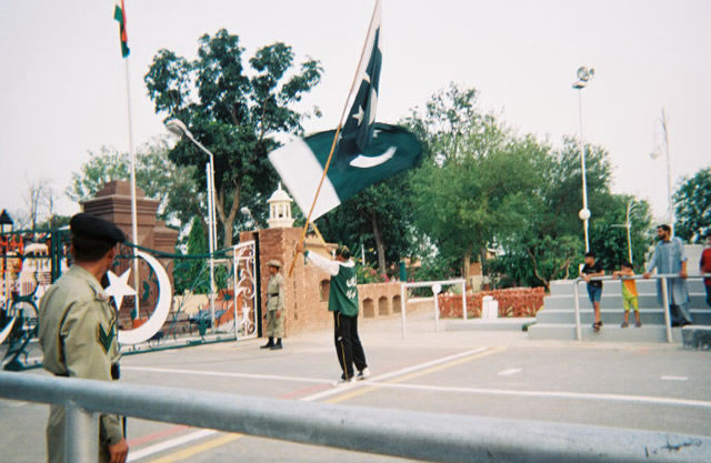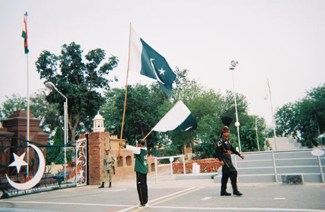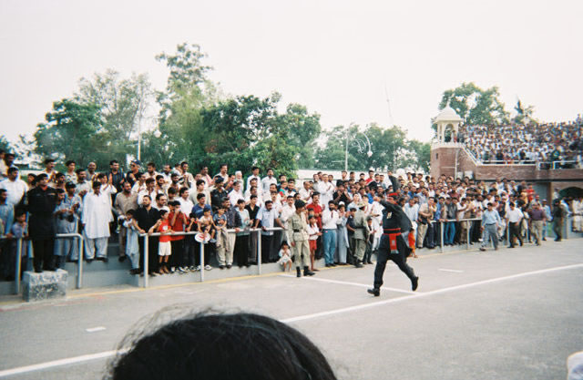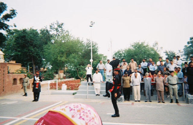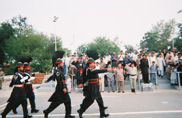 | Striding wide and kicking high before the superior officer (on the block) and the ministers (to the left of the officer). This guard earlier had brought a group of women to where we were standing and told Fazia to move because the women were guests. Fazia told him that we were guests too [and we did not move]. Pakistan is a male-dominated society, but that did not stop Fazia from speaking her mind. | ![]() |