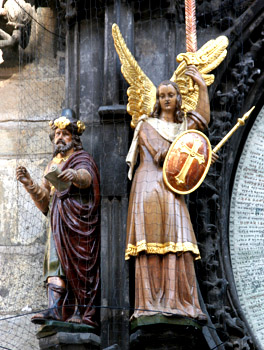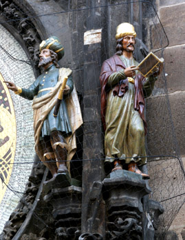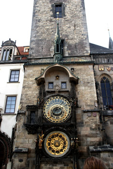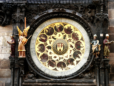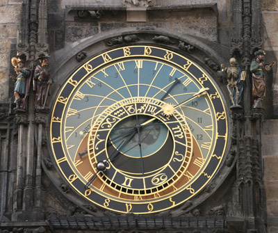 With revolving disks, celestial symbols, and sweeping hands, this clock keeps several versions of time. Two outer rings show the hour: Bohemian time in Gothic numbers and modern time in 24 Roman numerals. To indicate the times of sunrise and sunset, arcing lines and moving spheres combine with the big hand (a sweeping golden sun) and the little hand (the moon showing various stages). Look for the orbits of the sun and moon as they rise through day (the blue zone) and night (the black zone) |